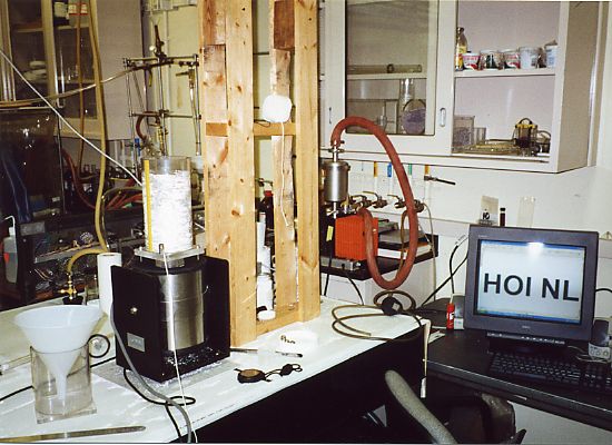 Hier kun je mijn plek zien: de magneet met de cylinder, de vacuum pomp (oranje slang) en natuurlijk de pc!!!