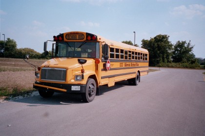 Met deze typisch Amerikaanse schoolbus reden we weer terug van het paintballpark naar Hyde Park