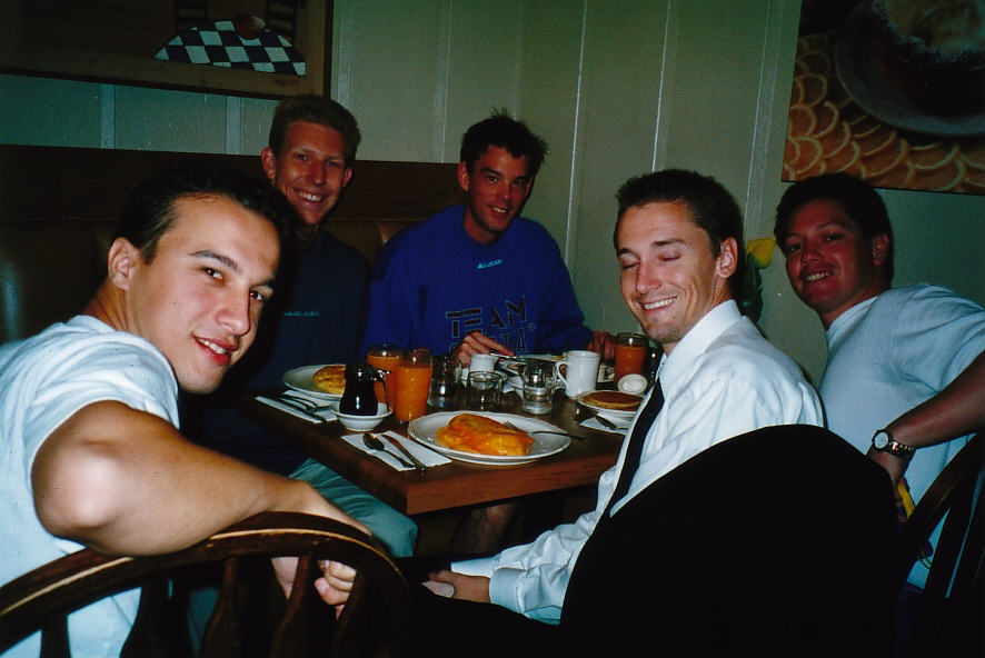 Een heel stevig ontbijt genoten we bij een Pancake House vlnr: Kazim, Moi, Jonas, Thomas en Willie